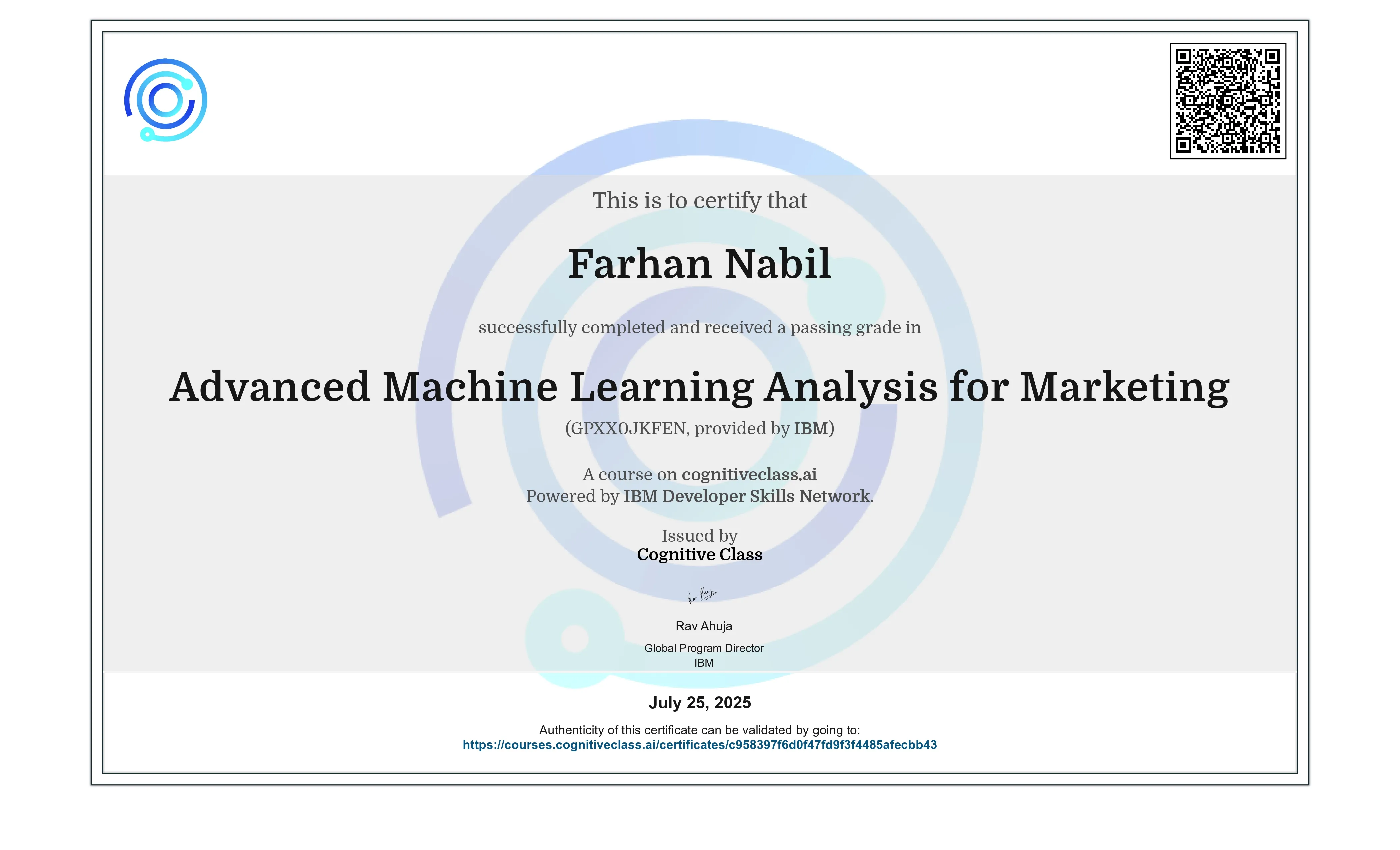 Confirms the achievement of advanced-level proficiency in machine learning techniques, tools, and deployment strategies, issued by IBM.